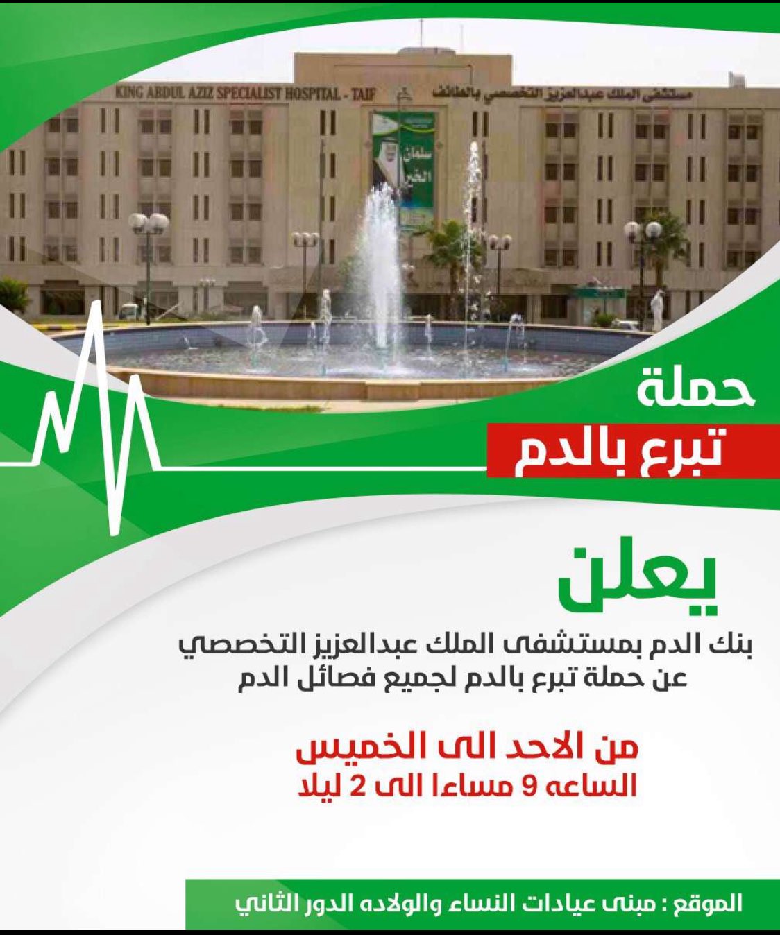 صـحــة الـطــائـف على تويتر يعلن مستشفى الملك عبدالعزيز التخصصي في صحة الطائف عن حملة تبرع بالدم لجميع فصائل الدم